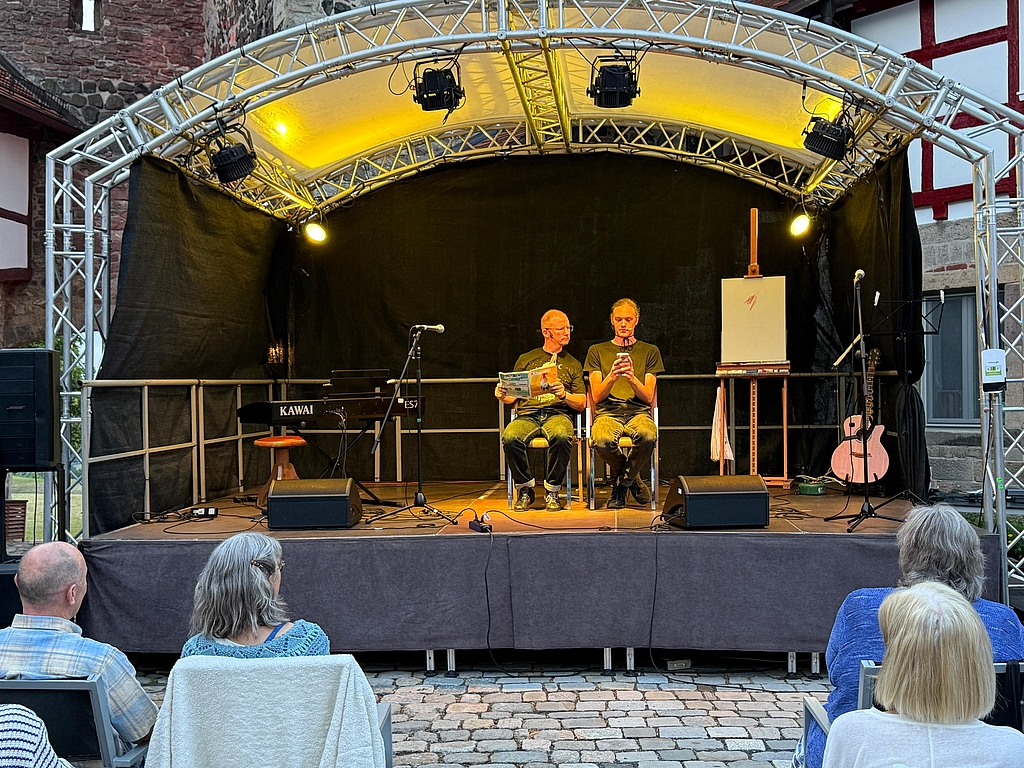 Eröffnet wurde der Abend von Davina Sauer-Wundling und Timm Kausmann, die charmant durchs Programm führten. Zuvor hatten Hartmut Piekatz, Direktor der Akademie Burg Fürsteneck, und Heiko Röhl, Vorsitzender der Bundesvereinigung Kabarett und Leiter der Akademie, die Gäste begrüßt – mit einem deutlichen Bekenntnis zur kulturellen Bildung und sichtbarer Freude über die lebendige Tradition dieser Workshoptage. Schon bald wurde klar: Hier stehen keine klassischen Profis auf der Bühne, sondern Menschen, die mit Leidenschaft, Haltung und überraschender Präsenz ihr Publikum mitreißen. So etwa Prolästerrat, ein Vater-Sohn-Duo, das seine „Do-it-yourself-Zahnarztpraxis“ samt VR-Brille und 30-Minuten-Tarif als Satire auf Selbstoptimierung und Sparzwang inszenierte. Die pointierte Absurdität brachte das Publikum zum Lachen – und zum Nachdenken.