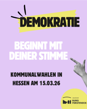 am kommenden Sonntag, den 15.03.2026, finden in Hessen die Kommunalwahlen statt. Als gemeinnütziger Verein und Einrichtung der politischen, kulturellen und beruflichen Bildung setzt sich die Burg Fürsteneck für demokratische Werte ein. Deshalb möchten wir Sie ermutigen, von Ihrem Wahlrecht Gebrauch zu machen und aktiv an der Gestaltung unserer demokratischen Gesellschaft mitzuwirken.