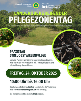 Die Verwaltungsstellen des Biosphärenreservats laden im Rahmen des länderübergreifenden Pflegezonentags zu verschiedenen Workshops und Mitmachaktionen ein. Mit dem länderübergreifenden Pflegezonentag wollen sie auf die Pflegebedürftigkeit der Streuobstbestände in der bayerischen, hessischen und thüringischen Rhön hinweisen und für deren Erhaltung und Pflege werben.
