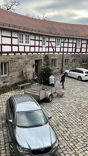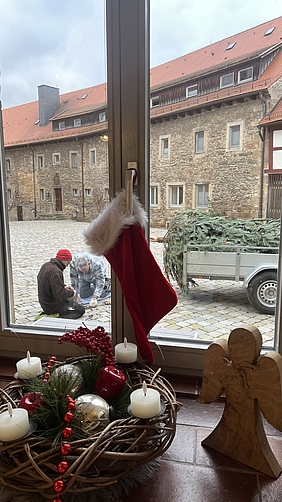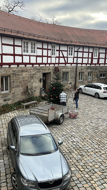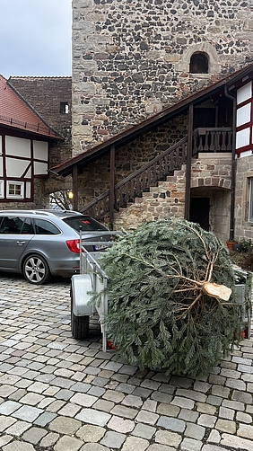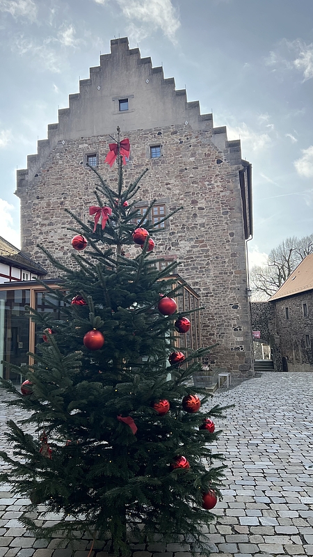 Gestern wurde auf der Burg der diesjährige Weihnachtsbaum aufgestellt und festlich geschmückt. Während er im vergangenen Jahr noch mitten in der Baustelle stand, darf er nun vor der frisch sanierten Fassade glänzen – und strahlt mit den schwedenroten Balken um die Wette.