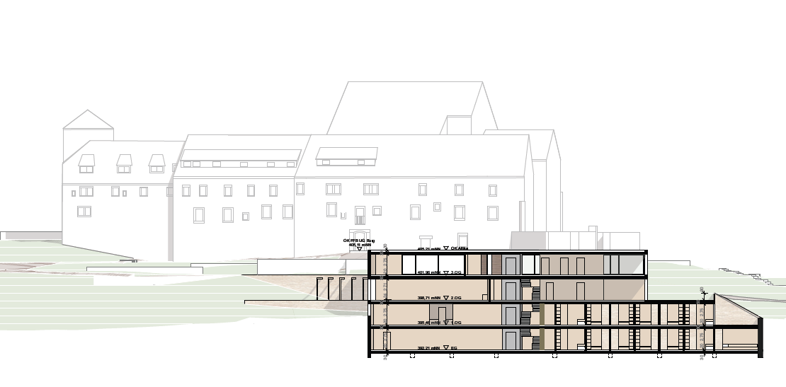 Das neue insgesamt vierstöckige Gebäude wird übrigens links von der Burg und dem umlaufenden Weg im Hang entstehen, etwa von der ehemaligen Freilichtbühne bis zum Rondell hinter dem Ölbunker. Das Gelände dahinter sowie drumherum wird neu gestaltet, so dass sich später ein wunderbarer Ausblick Richtung Burgwiese öffnet.