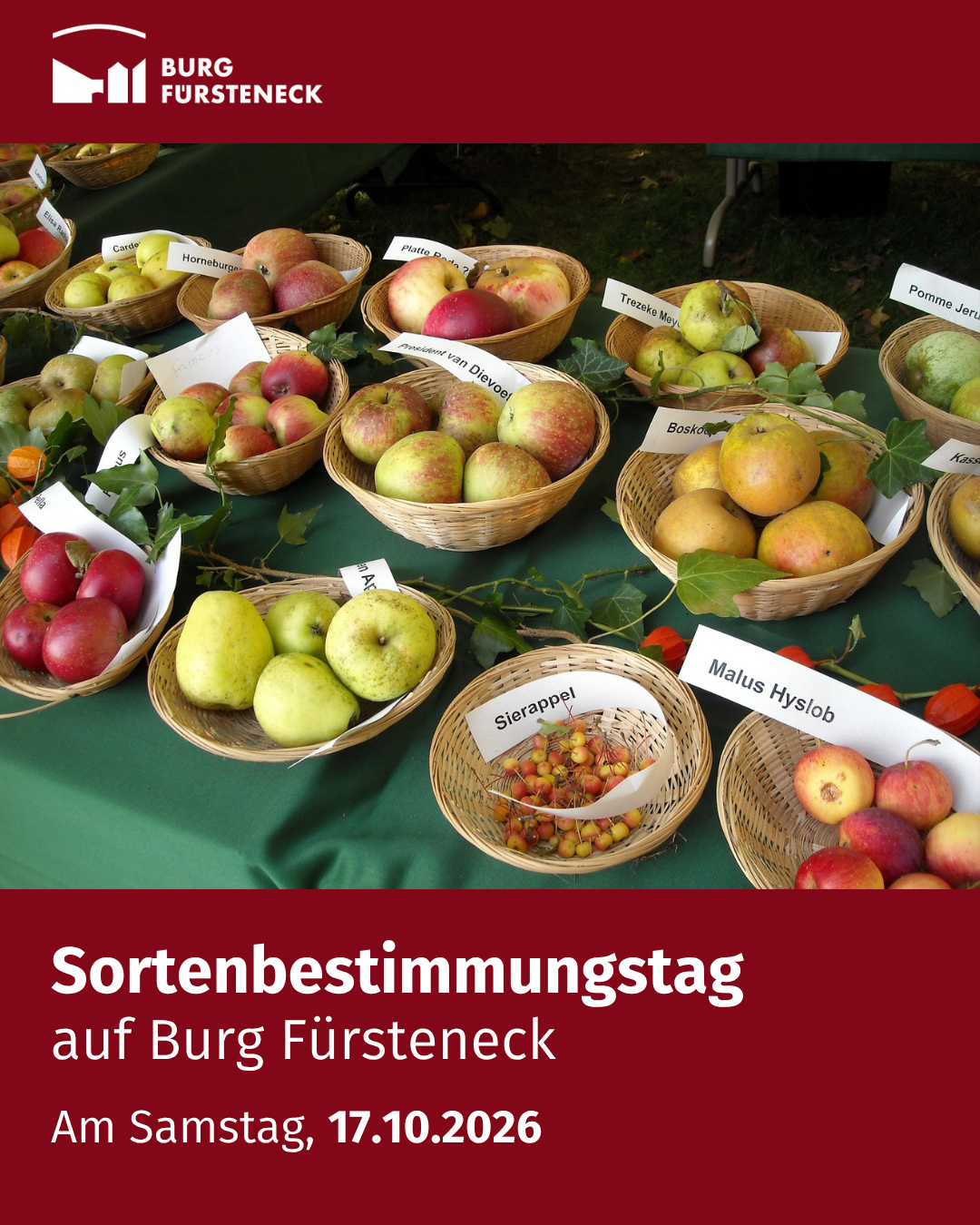 “Welcher Apfel ist das denn?” - Nur was man kennt, kann man schützen! Damit die Vielfalt der Rhöner Streuobstwiesen erhalten bleibt, kommt ein Pomologe zur Sortenbestimmung für Rhöner Streuobstäpfel und Birnen auf die Burg Fürsteneck. Am Samstag, den 17.10.2026, steht Jan Bade für Interessierte von 13 bis 17 Uhr Rede und Antwort. Veranstalter ist das Biosphärenreservat Rhön in Kooperation mit der Akademie.